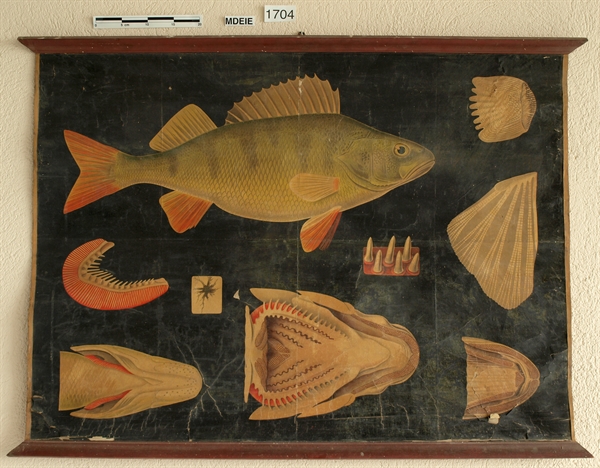 Per a il·lustrar aquest article hem triat una de les làmines que, tot i que no és de les més maques, està en prou bon estat i es veu prou bé en blanc i negre. La coloració que té és molt especial (tons de verd, vermell i marró molt suaus sobre el fort fons negre). Es tracta de l’esquema d’una perca (Perca fluviatilis), voltada dels dibuixos de diverses parts del seu cos.